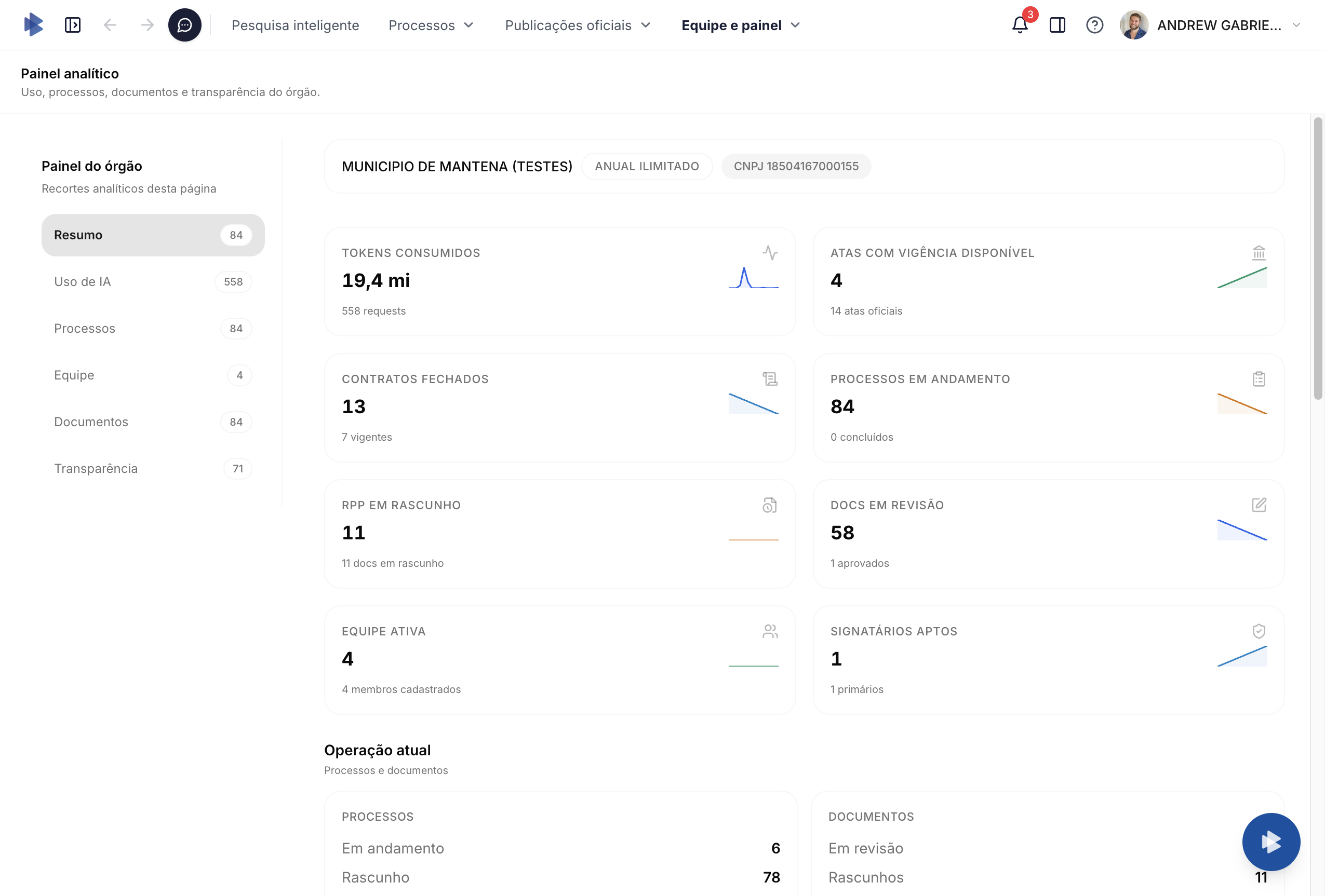 Embora o layout evolua com o produto, a lógica permanece:- Resumo numérico - quantidade de itens em análise, processos ativos, tarefas em aberto ou atrasadas.