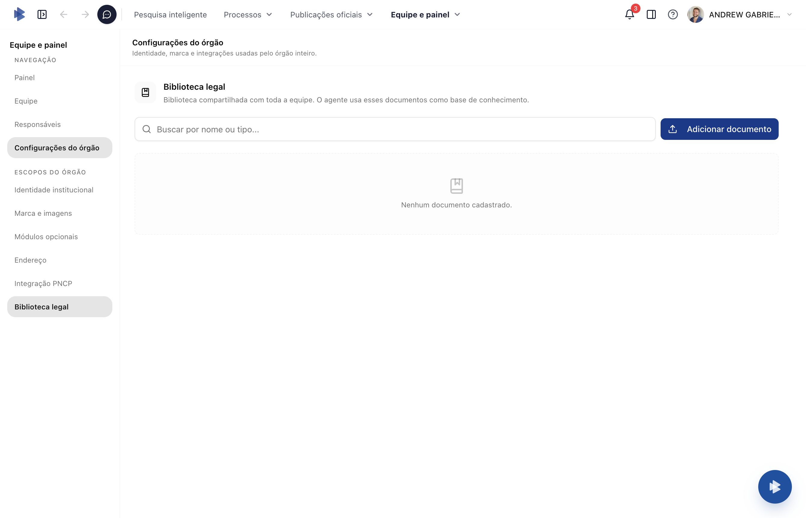 /tenant-settings, com secções como identidade, biblioteca jurídica, integrações e outras políticas. Isto é diferente de /settings quando essa rota existir como preferências do utilizador.